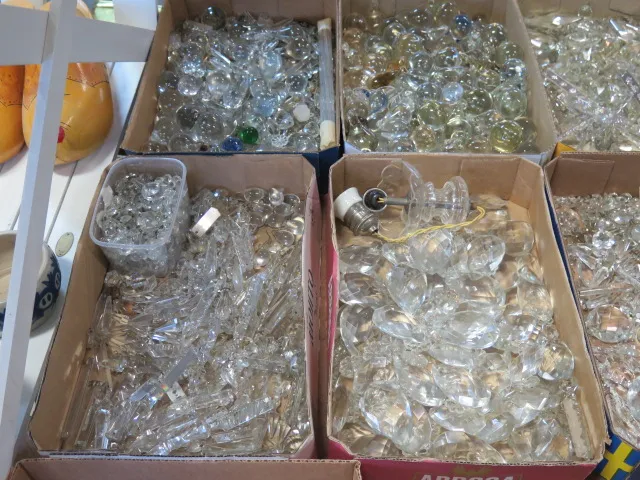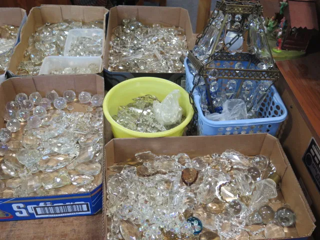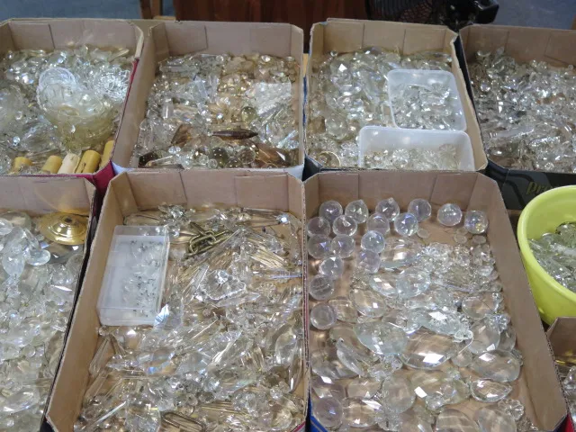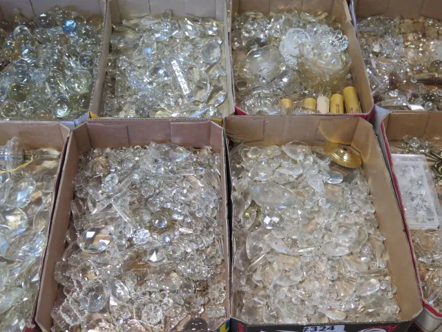 394. 14 lådor fyllda med lampkristaller för renoveringar..
