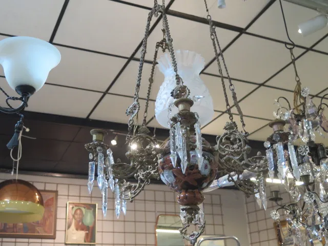 Antik 6-armad Majolika elektrifierad takfotogenlampa d-60 cm.. h-varierande..