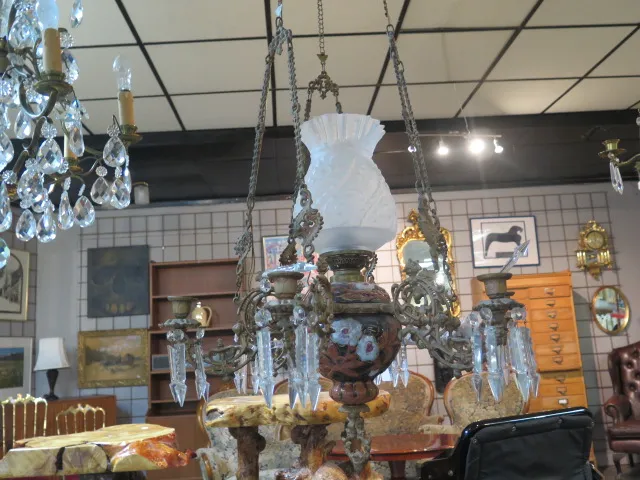 Antik 6 armad takfotogenlampa majolika 1800-tal d:60 cm
