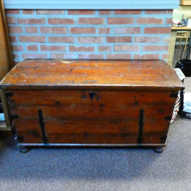 Antik järnbeslagen kista med välvt lock l:130 cm