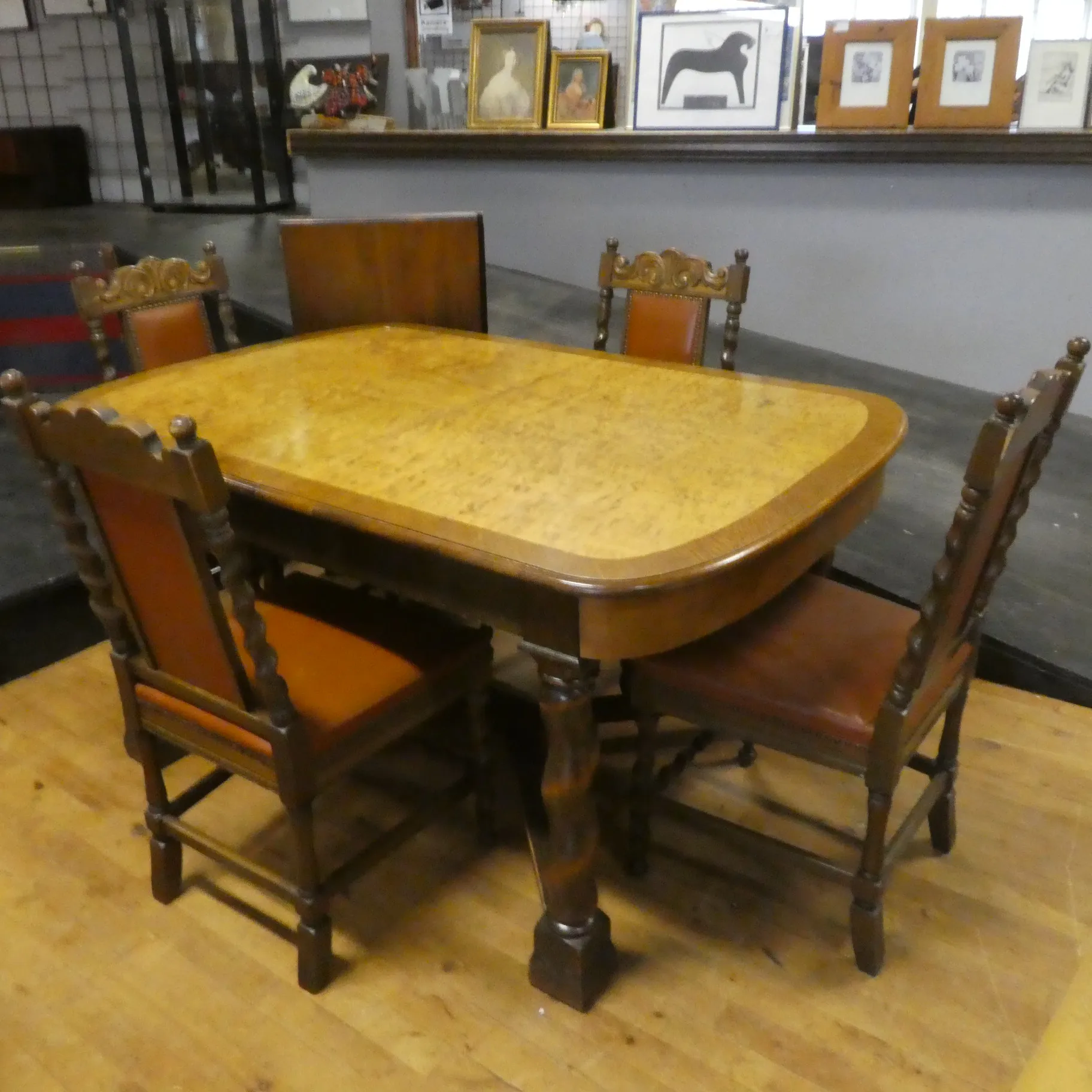 Antik matsalsbord 3 iläggskivor rikt skurna stolar barock 4 st