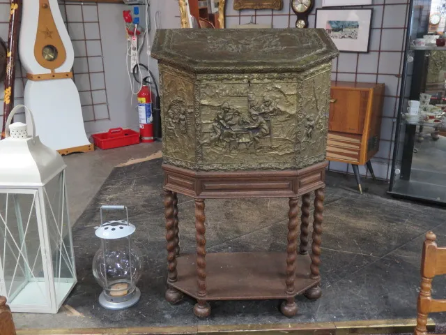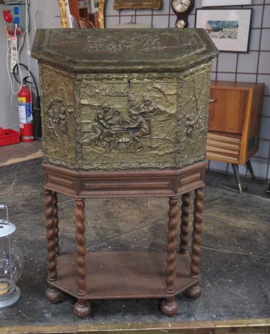 Antik reliefdekorerad barockkista på benställing .. 65x40x106 cm