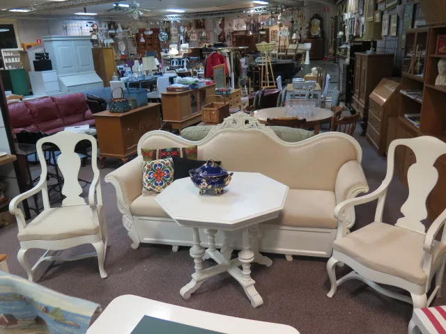 Antik salongsgrupp.. soffa, paret pampiga karmstolar, bord