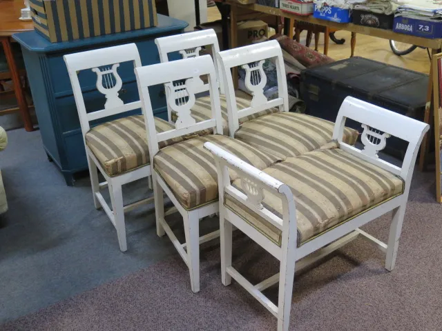 339. Antika vitmålade lyrstolar + taburett