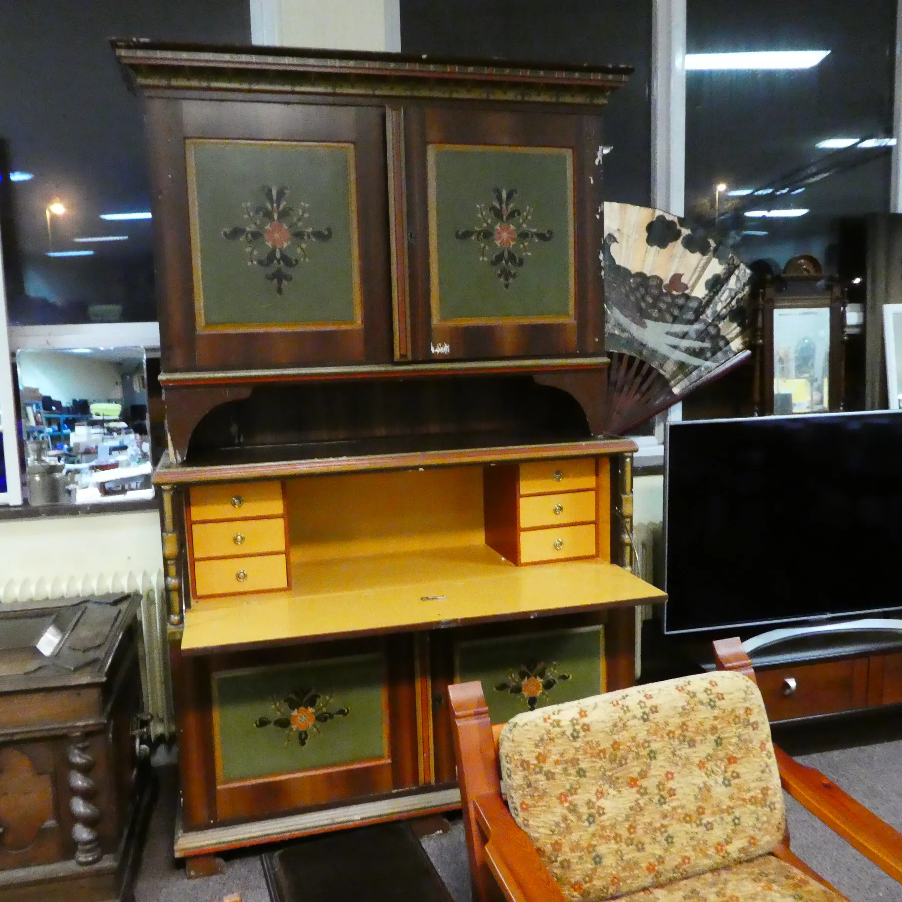 Antikt bemålat herrgårdsskåp m skrivklaff 140x228 cm