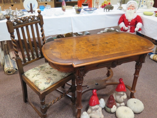 Antikt salongsbord valnöt 1800-tal l:120 cm/dekorskuren stol
