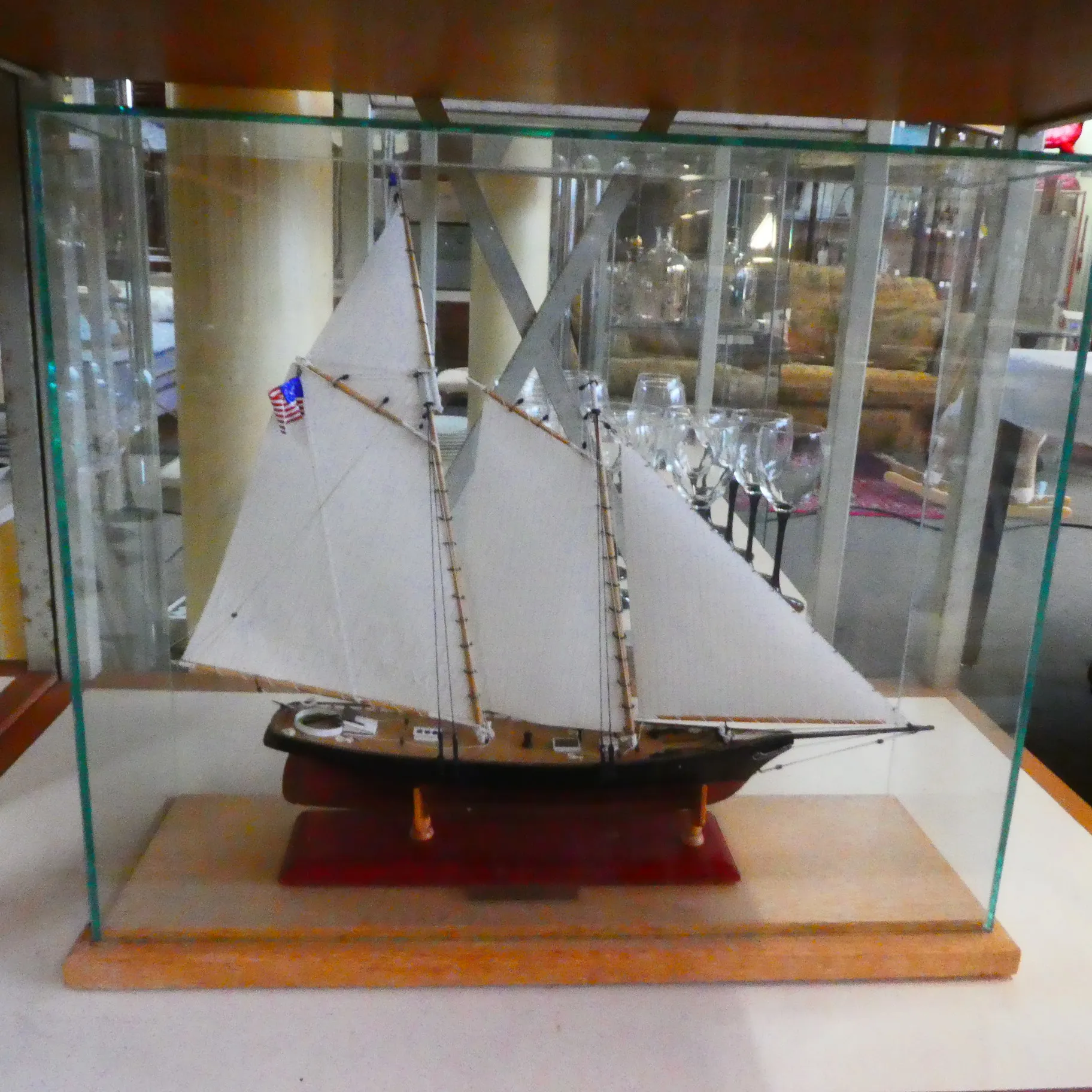 391. Båtmodell S/S America i monterglas l:50 cm