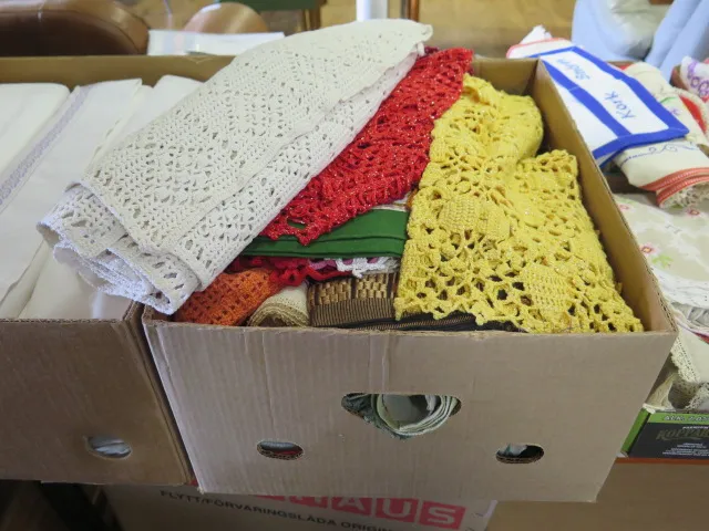 441. Låda broderade virkade dukar