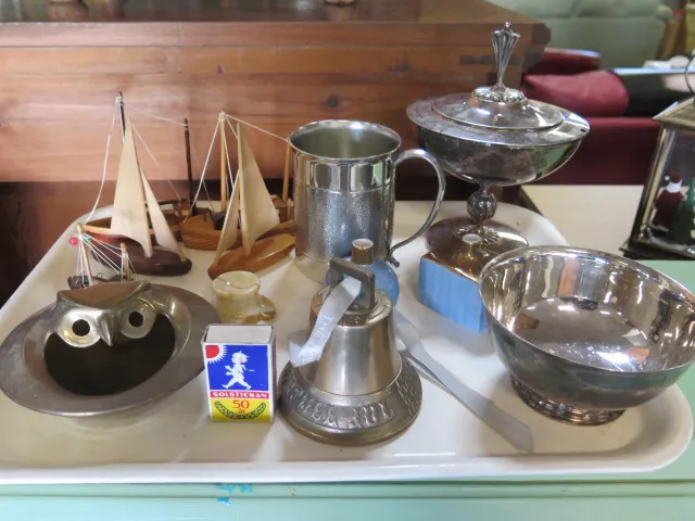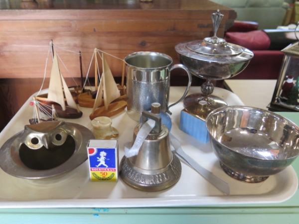 381. Bricka båtmodeller fotskål NS malmklocka mm