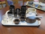 367. Bricka knivställ almoge ask Blå Blomster skålar mm