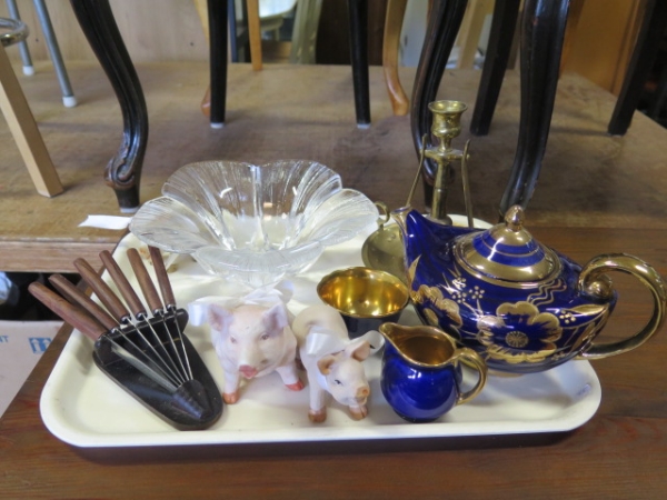 Bricka knivställ ljusstake mässing gulddekorerad kanna