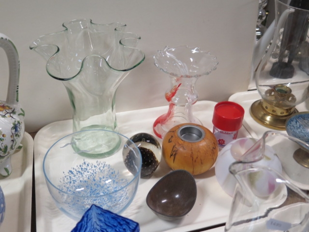 222. Bricka konstglas vaser skålar ...