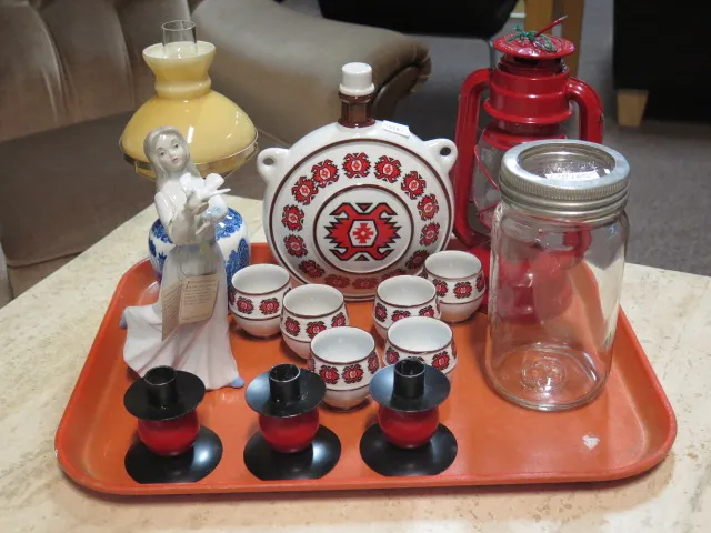 Bricka lykta porslinsfigur ljusstakar vodkaservis..