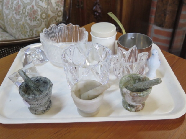 77. Bricka marmormortlar koppardegel kristallskålar mm