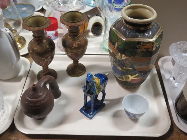 226. Bricka konstglas vaser figuriner