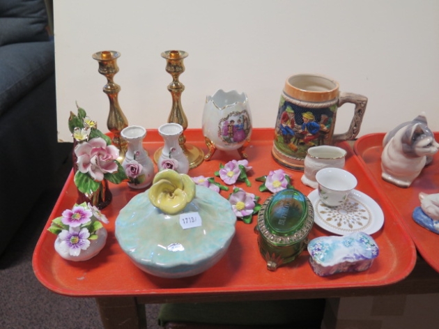 252. Bricka samlarstop bordsljusstakar mässing porslinsblommor Herend mm