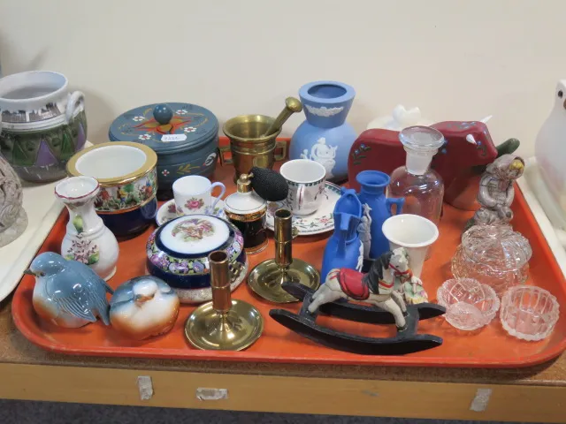 61. Bricka småfiguriner nipperask ljusstakar mortel mm