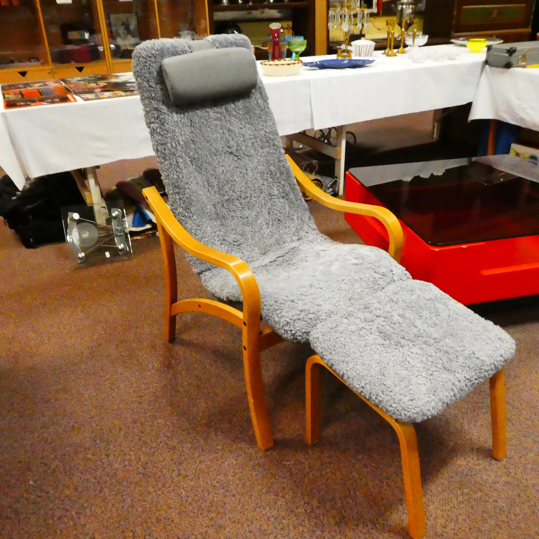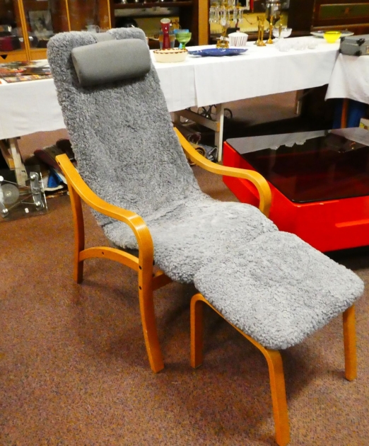 223. Fårskinnsfåtölj ANNE m fotpall grå/silver MIO Möbler