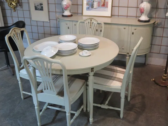 529. Gustaviansk matsalsgrupp bord 2 ilägg 4 stolar skänlskåp
