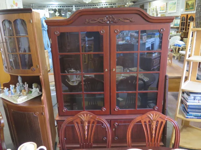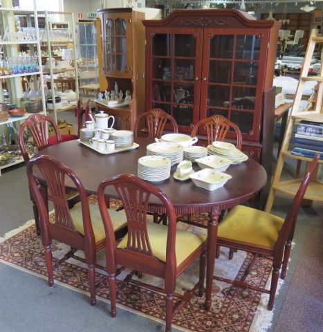 368. Gustaviansk matsalsgrupp porslinskåp bord 2 ilägg 6 stolar