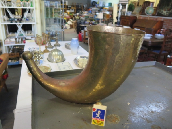 Handdriven mässinghorn tillika bordsvas l:36 cm