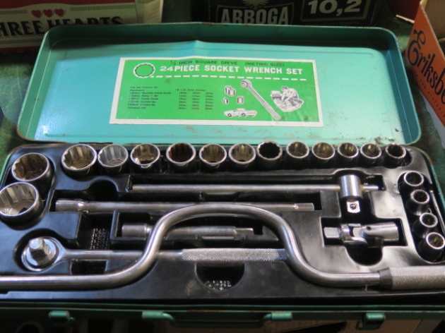 536. Låda fylld m verktyg.. block/ringnycklar