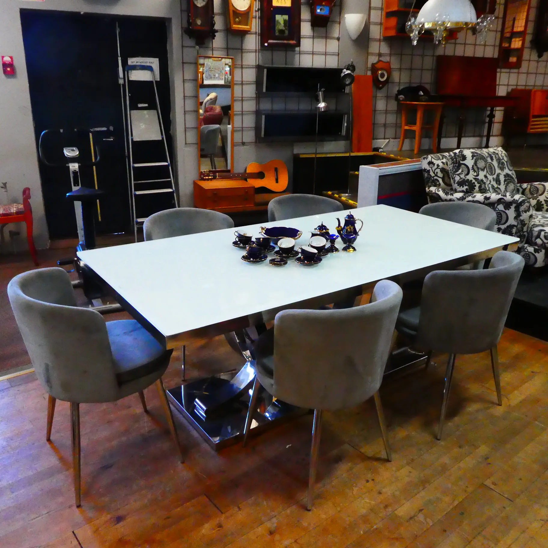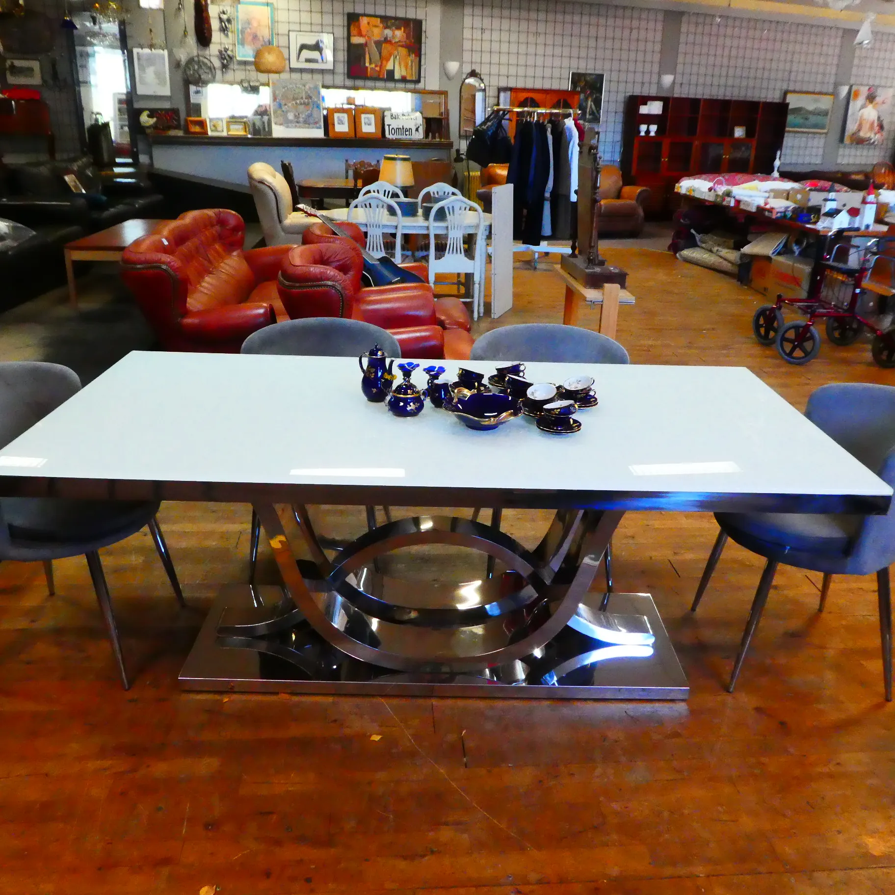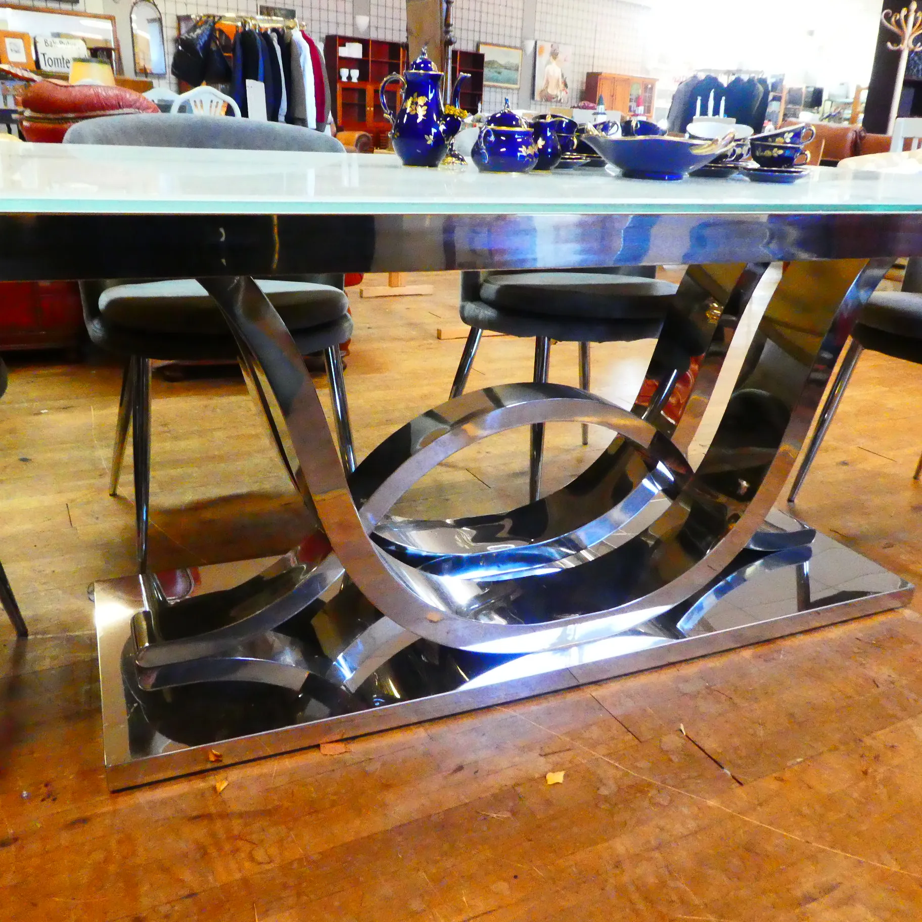 Italienskt matsalsgrupp bord glasskiva på kromad benställning.. 6 stol