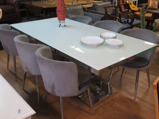 365. Italienskt matsalsgrupp bord glasskiva på kromad benställning.. 6 stol