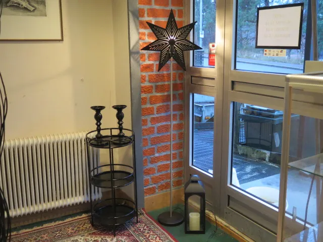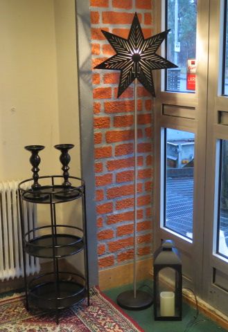 1. Julstjärna, paret bordsljusstakar, metallhylla på hjul, lykta