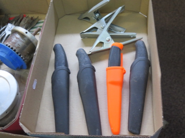 Låda 4 st Moraknivar nya.. oanvända samt klämmor