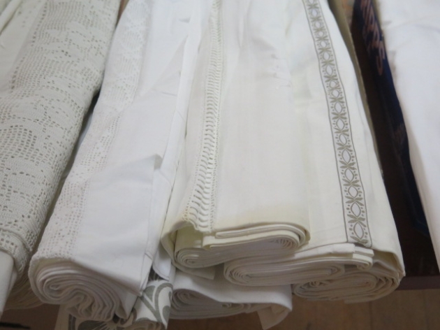 410. Låda 5 st lakan broderade.. virkade