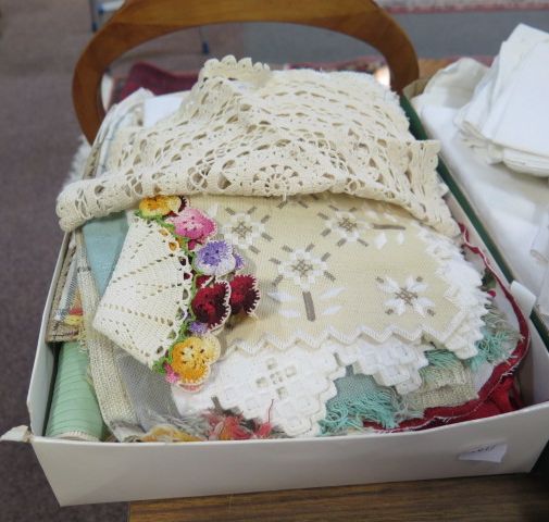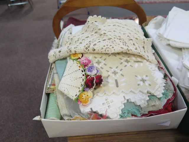 463. Låda blandade dukar.. virkade.. broderade.. linne mm