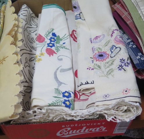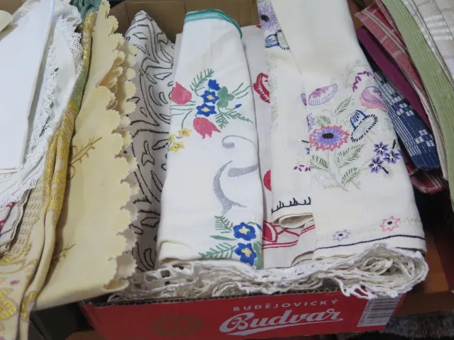 327. Låda broderade äldre dukar