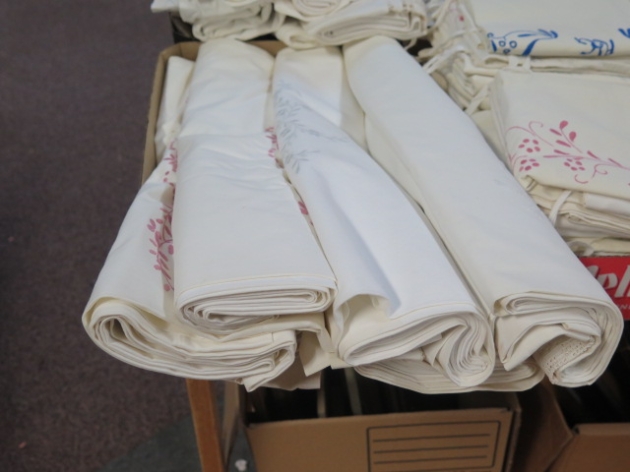 418. Låda broderade virkade lakan 7 st