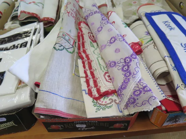 430. Låda broderade virkade dukar