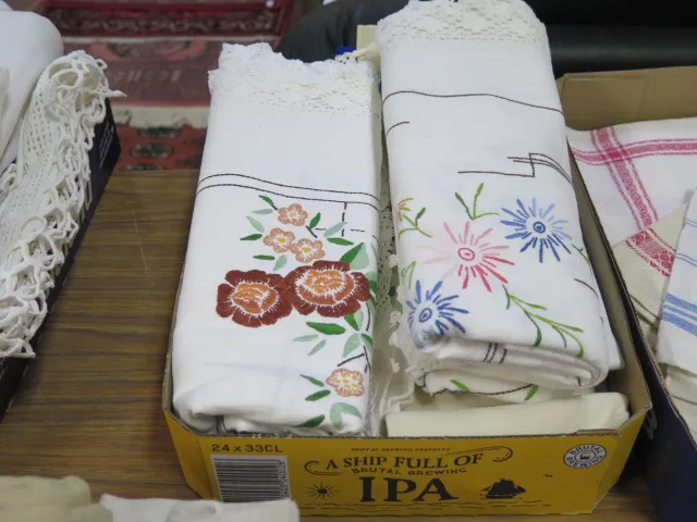 440. Låda dukar.. broderade.. virkade..