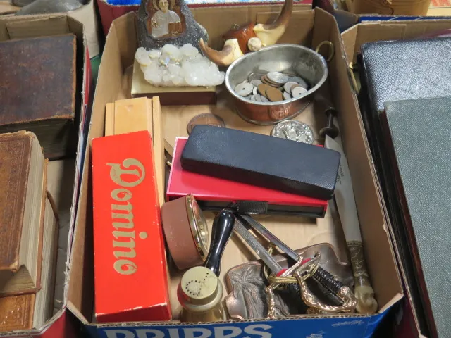 Låda dominospel mynt kulspetspennor .....
