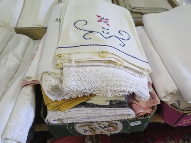 424. Låda dukar.. broderade virkade linnedukar mm
