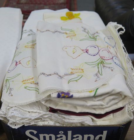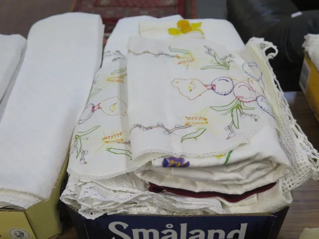 440. Låda dukar.. broderade.. virkade..