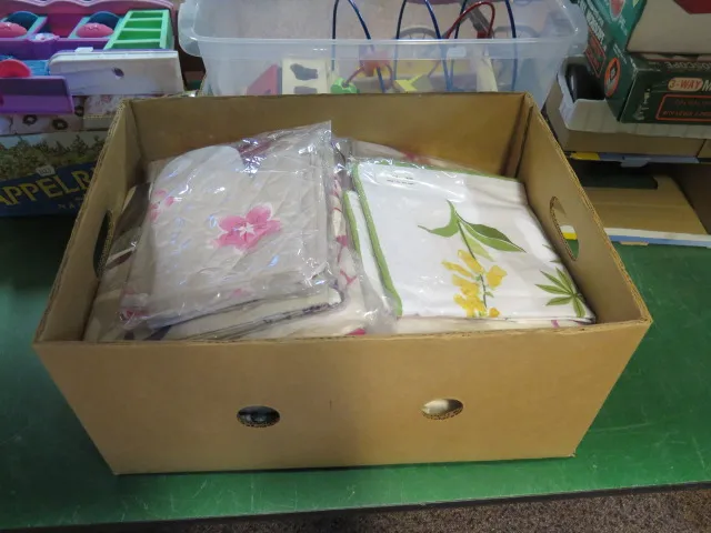 156. Låda gardiner mm