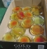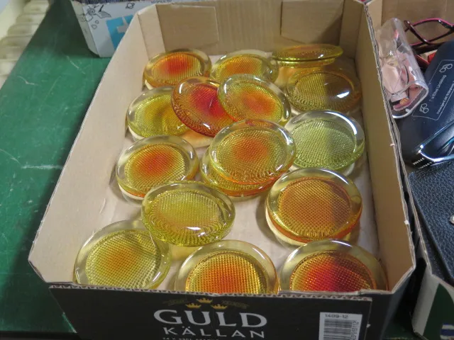 Låda glasbrickor/lampdelar 70-tal