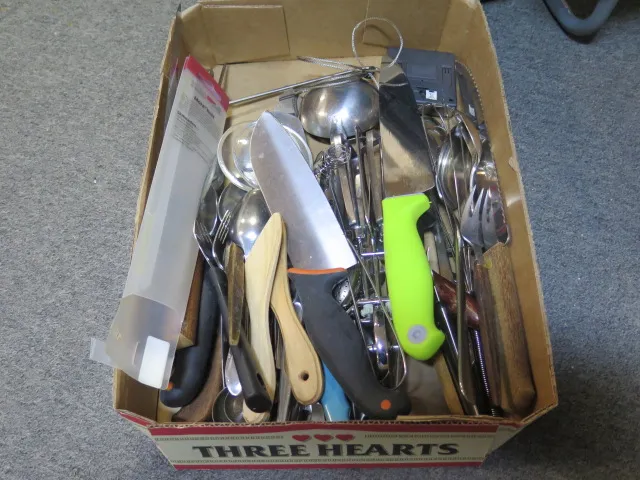 Låda husgeråd bestick knivar