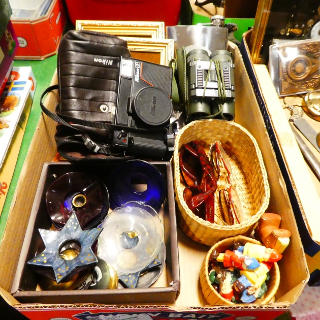 180. Låda mynt fällkniv ljusstakar klocktavla mm