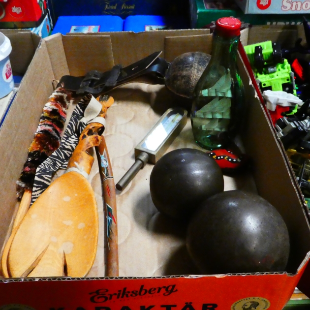 Låda kanonkulor flaskskepp bjällra mm