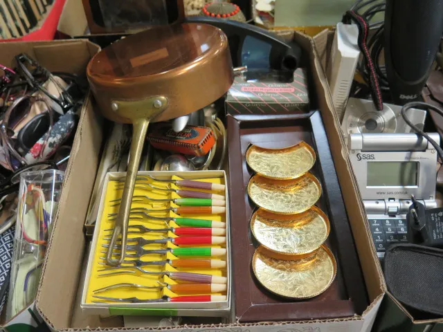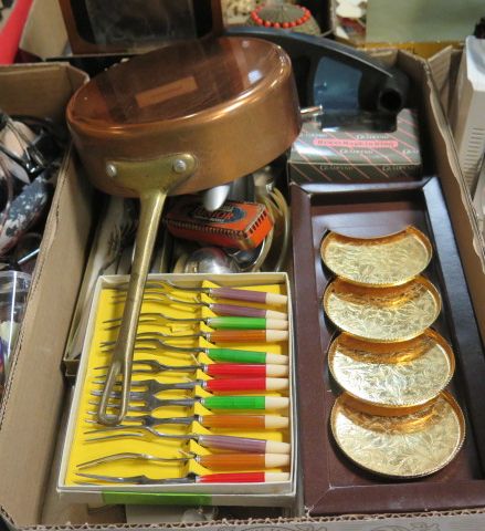 165. Låda kopparpanna vinkork bestick...
