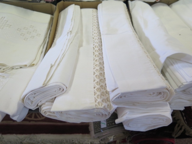435. Låda lakan örngott Hardangersöm mm