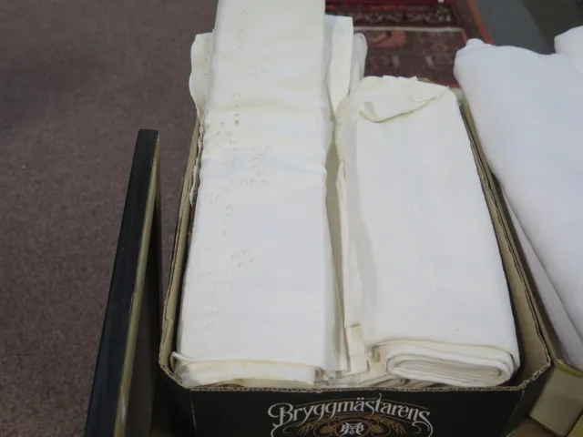 439. Låda vita bordsdukar..