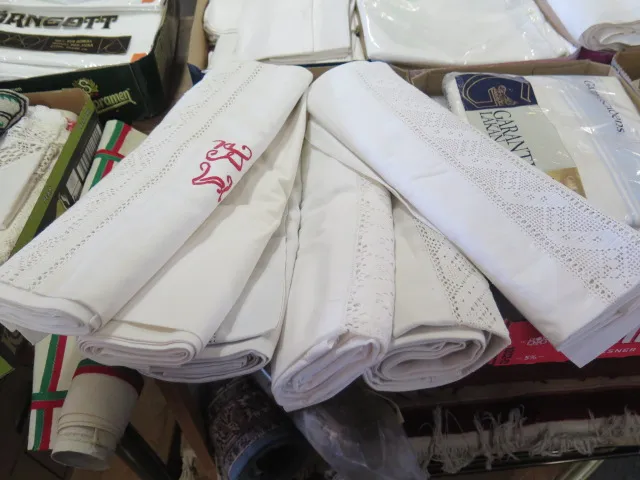 438. Låda lakan.. spetsvirkade mm.. 6 st