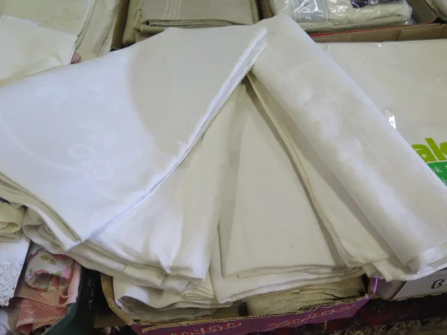 424. Låda dukar.. broderade virkade linnedukar mm