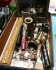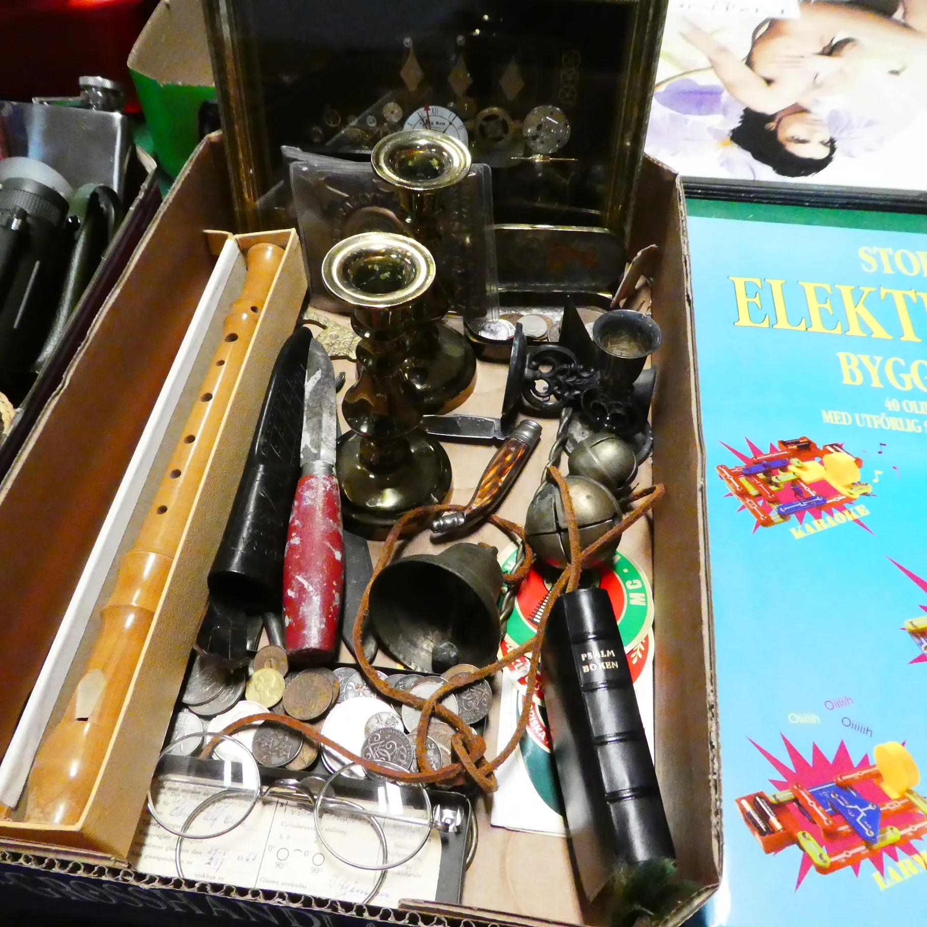 Låda mynt fällkniv ljusstakar klocktavla mm